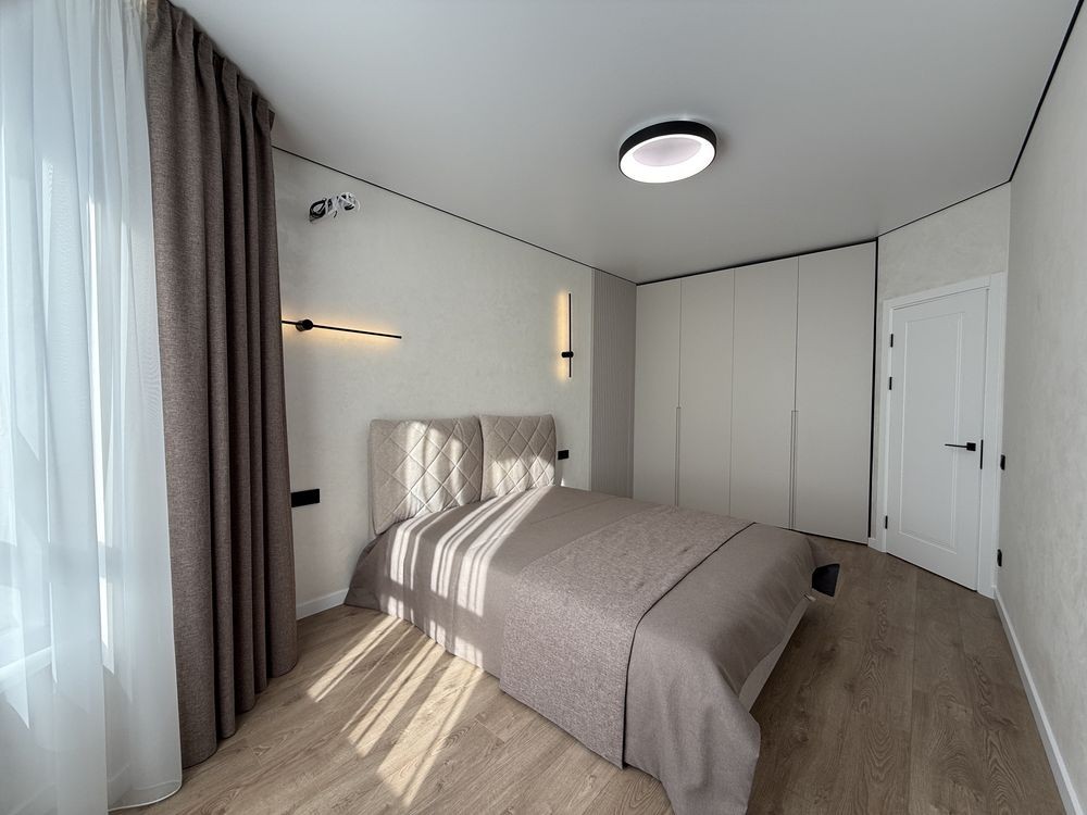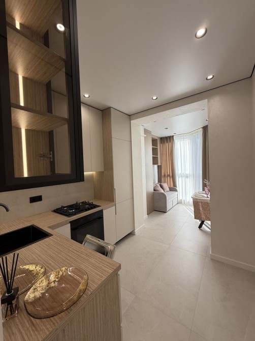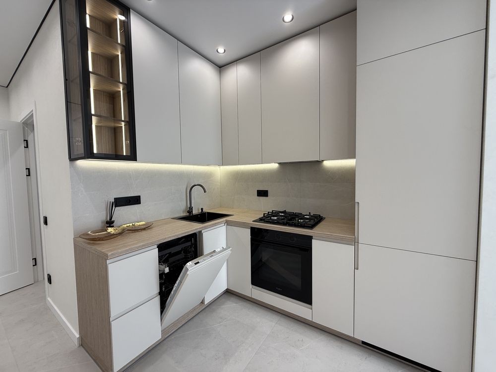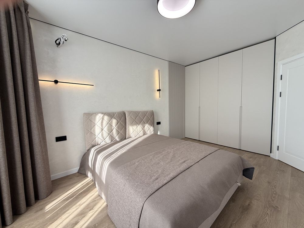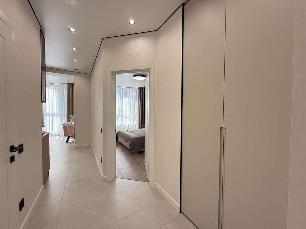 Просторий коридор з шафою. Затишна кімната зі зручним ліжком та величезною шафою. Кухня вітальня просто бусінка. Вбудовані меблі з крашеним фасадом, вбудованою технікою, включаючи посудомийку. На лоджії біля панорамного вікна ідеально став гостьовий диван та обідня група.