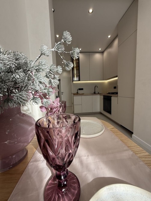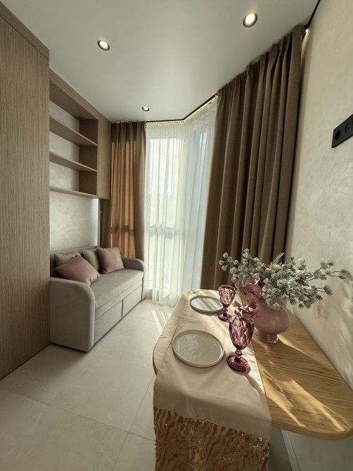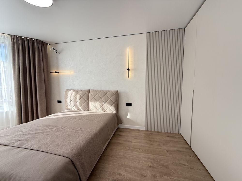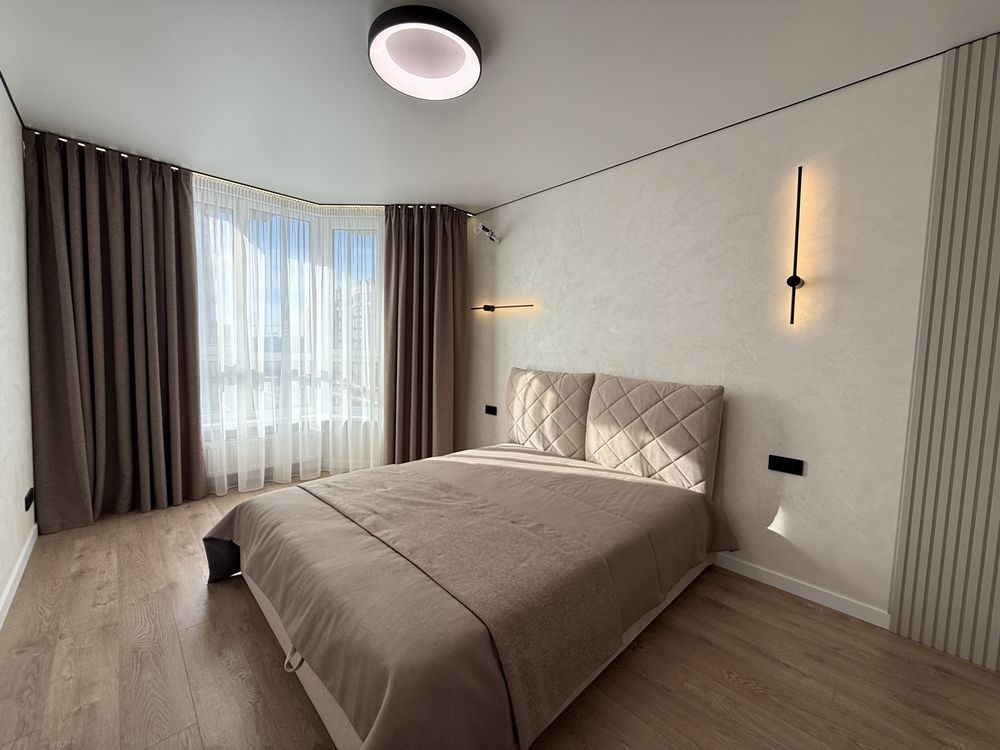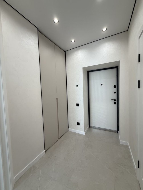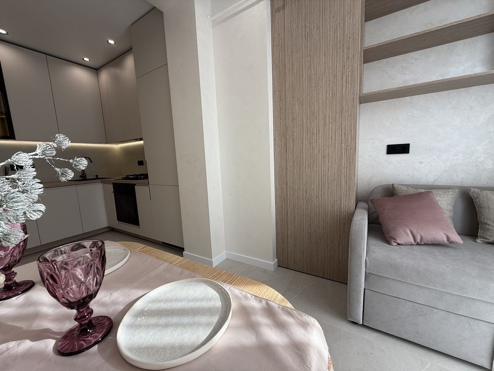 Просторий коридор з шафою. Затишна кімната зі зручним ліжком та величезною шафою. Кухня вітальня просто бусінка. Вбудовані меблі з крашеним фасадом, вбудованою технікою, включаючи посудомийку. На лоджії біля панорамного вікна ідеально став гостьовий диван та обідня група.