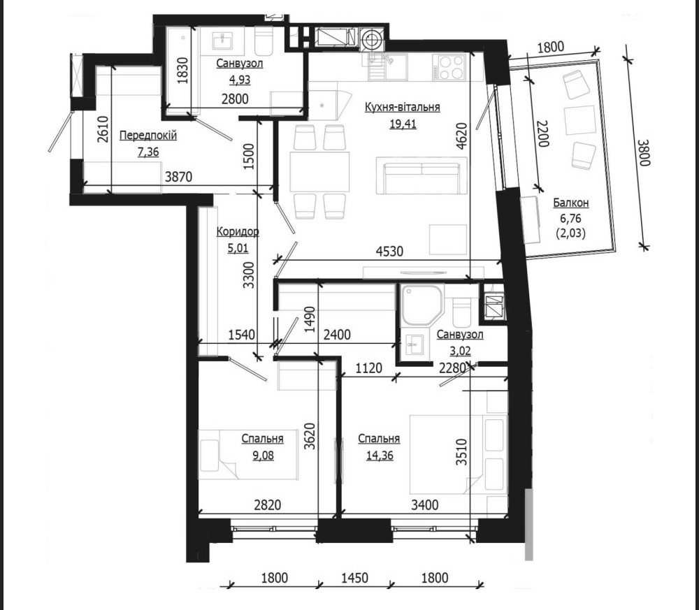 • Площа кухні 19.41 м2