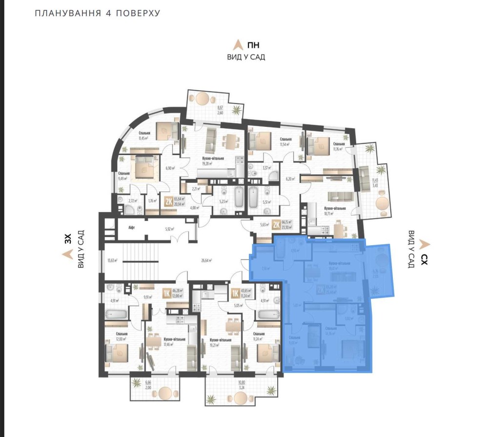 Квартира розташована на четвертому поверсі з шести. Загальна площа 65,2 м2. Південо-східна сторона.