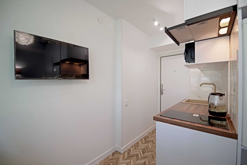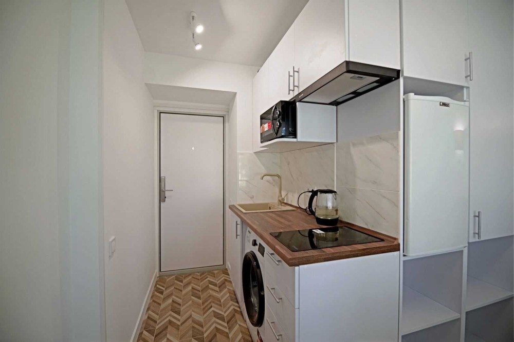 Техніка: мікрохвильова піч, компактний холодильник, електрична варильна поверхня, витяжка, електрочайник, бойлер, пральна машина преміум класу (безшумна), LCD телевізор (32 дюйми). Інтернет.