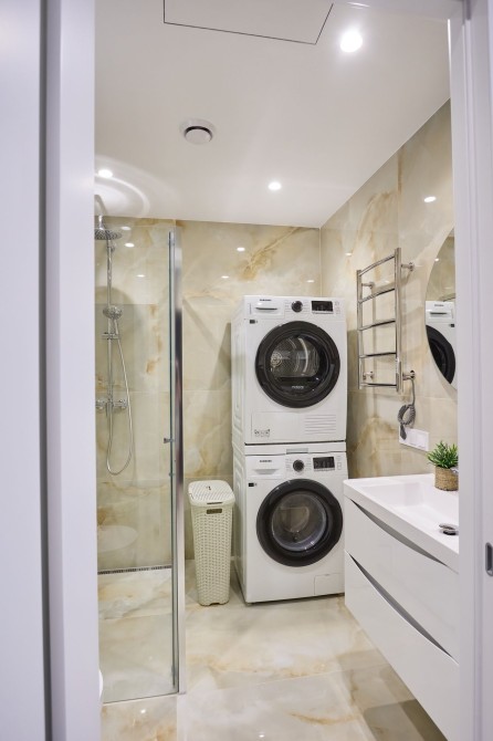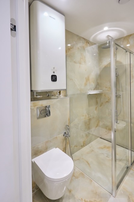 Санвузол сумісний в якісному кахелі з сантехнікою відомих брендів, гігієничний душ, великий бойлер 85 л., душова кабіна з тропічним та звичайним душем, електросушарка, дзеркало з підсвіткою, містка тумба.
