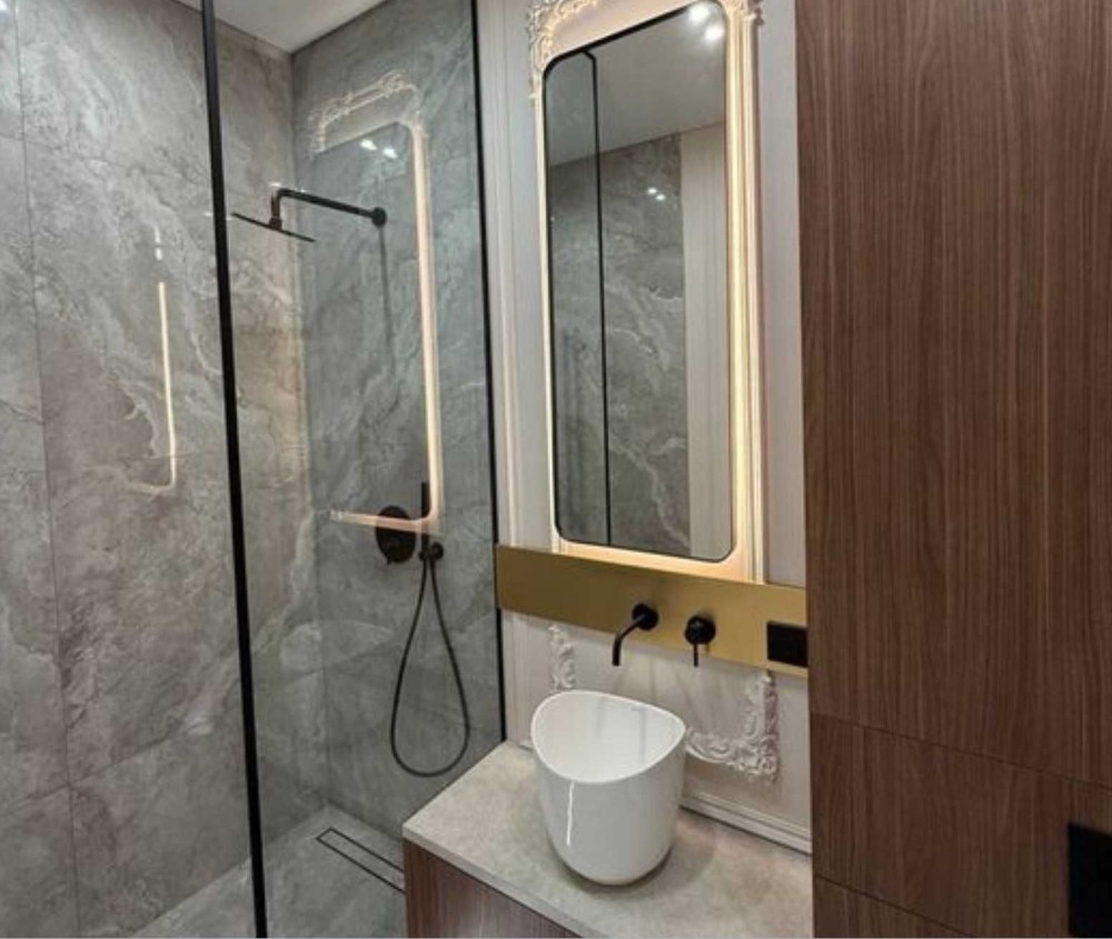 Теплые полы в сан узлах и на душевых поддонах. Панорамный вид на море.