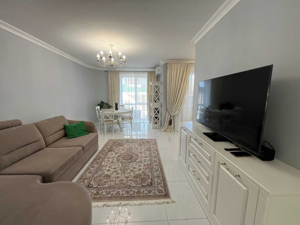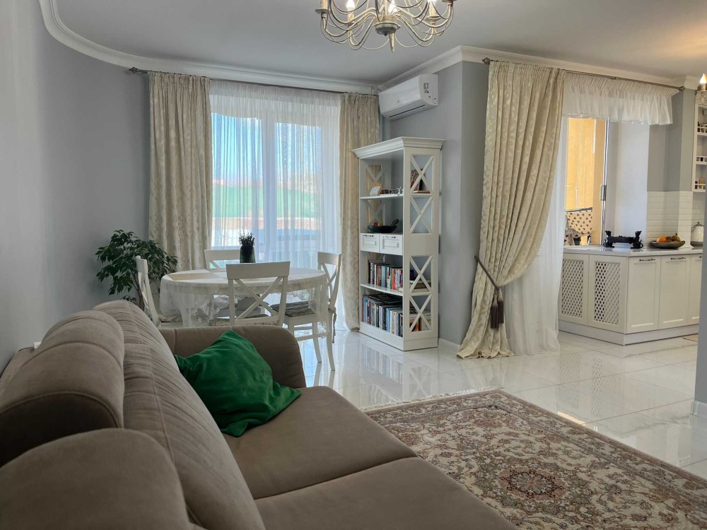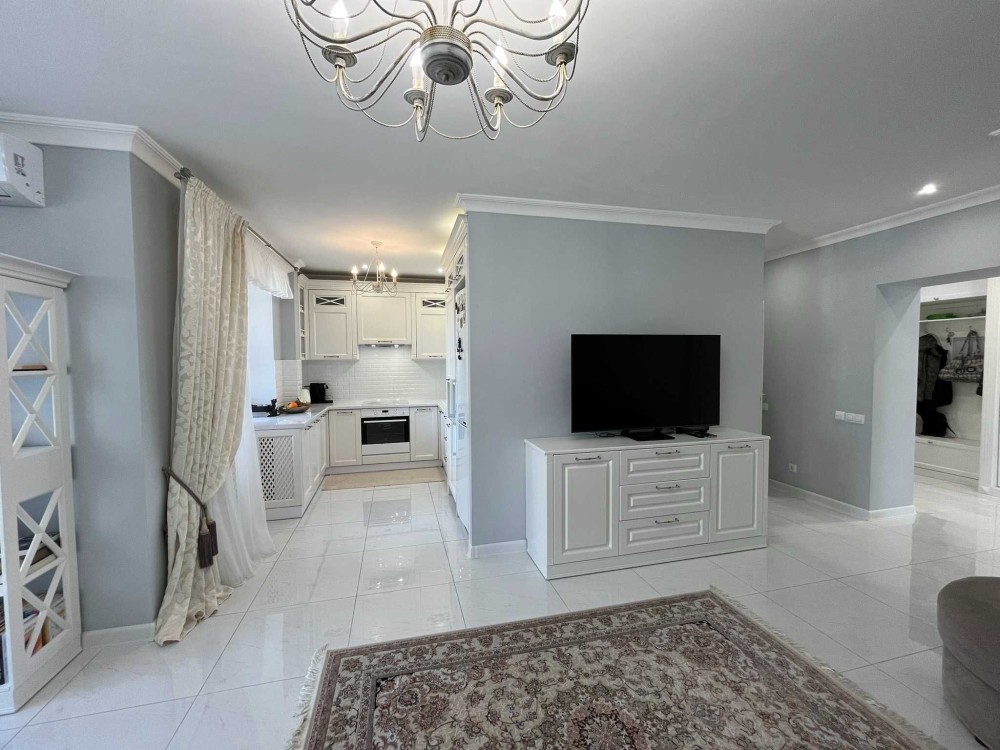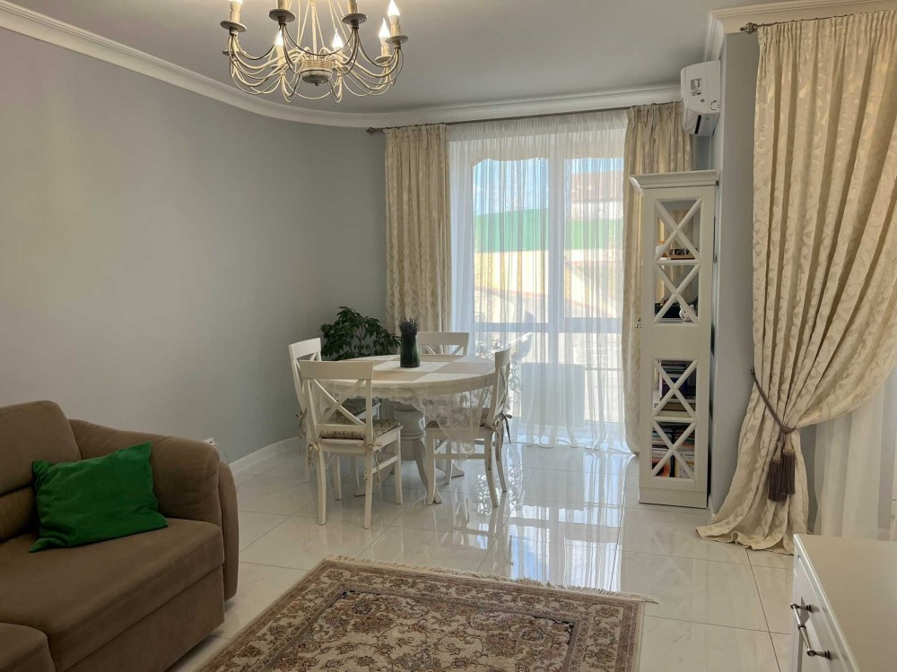 -Шикарна кухня-столова -гостьова розділена на обідню зону з панорамним вікном, робочу кухонну зону з виходом на балкон та гостьовий простір з розкладним диваном та великою плазмою. Спліт система на обігрів та на охолодження.