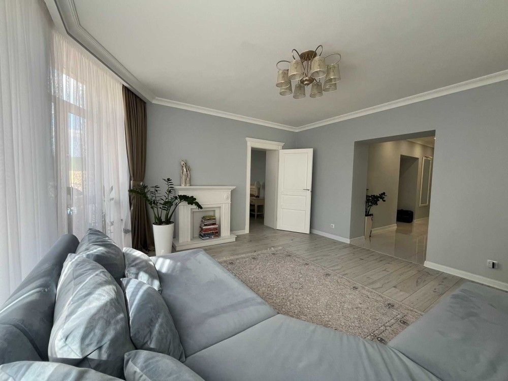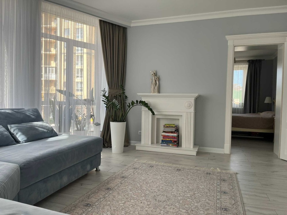 - Окрема вітальня для відпочинку з комфортним диваном та каміном в центрі квартири, панорамні вікна та багато світла нікого не залишать байдужими.