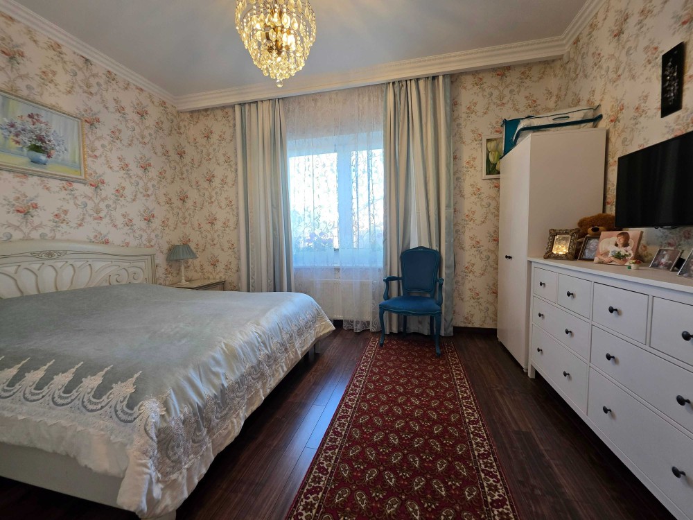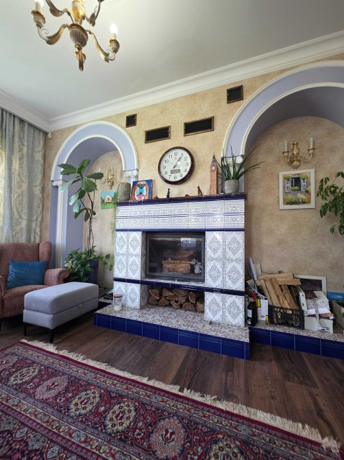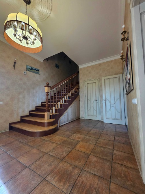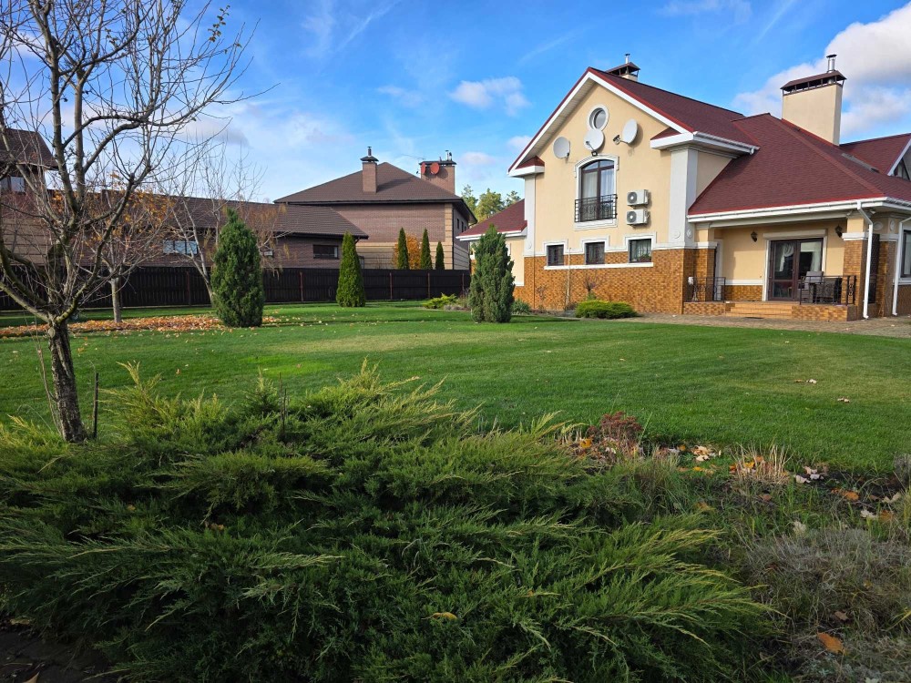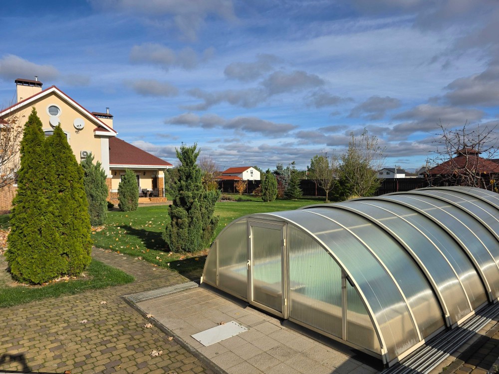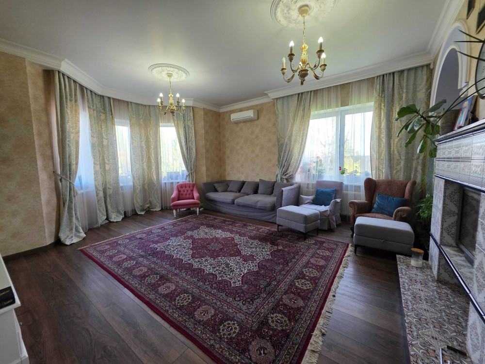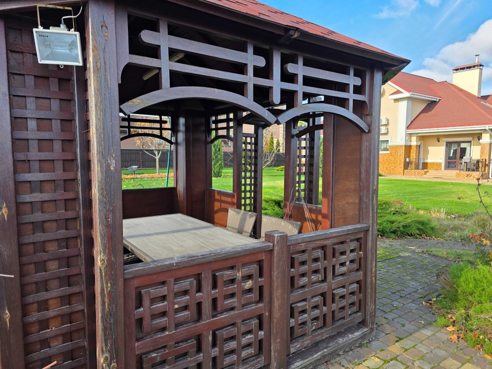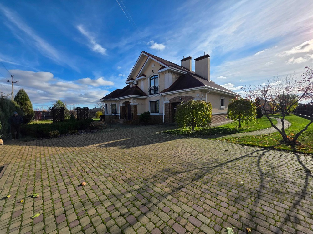 Загальна площа двоповерхового будинку - 230м.кв., раціональне планування, велика кухня, вітальня з каміном, тераса, бойлерна, комора, окремі чотири спальні кімнати, кабінет, баня з басейном, літній басейн з куполом на вулиці, альтанка, барбекю зона. На території ділянки є господарський будинок з погребом і дровником. В наявності генератор на 8 кВт, гараж на 2 автомобіля. Електро та газовий котли на опалення.