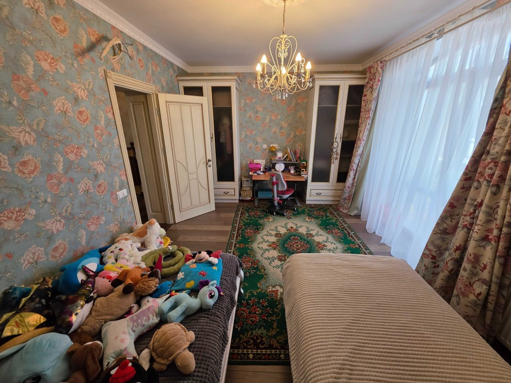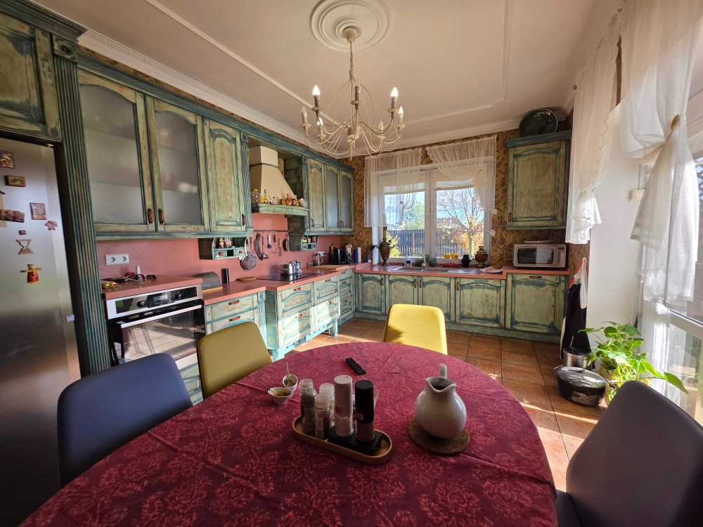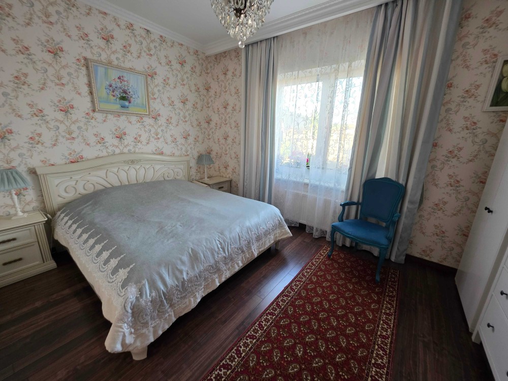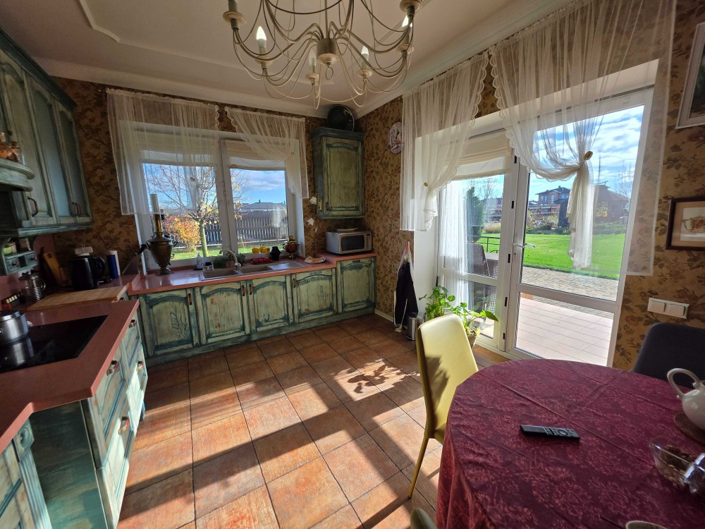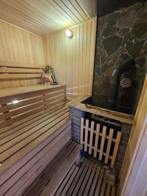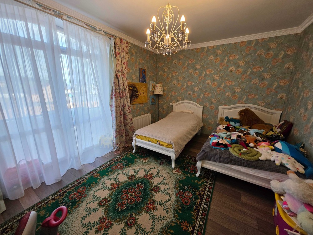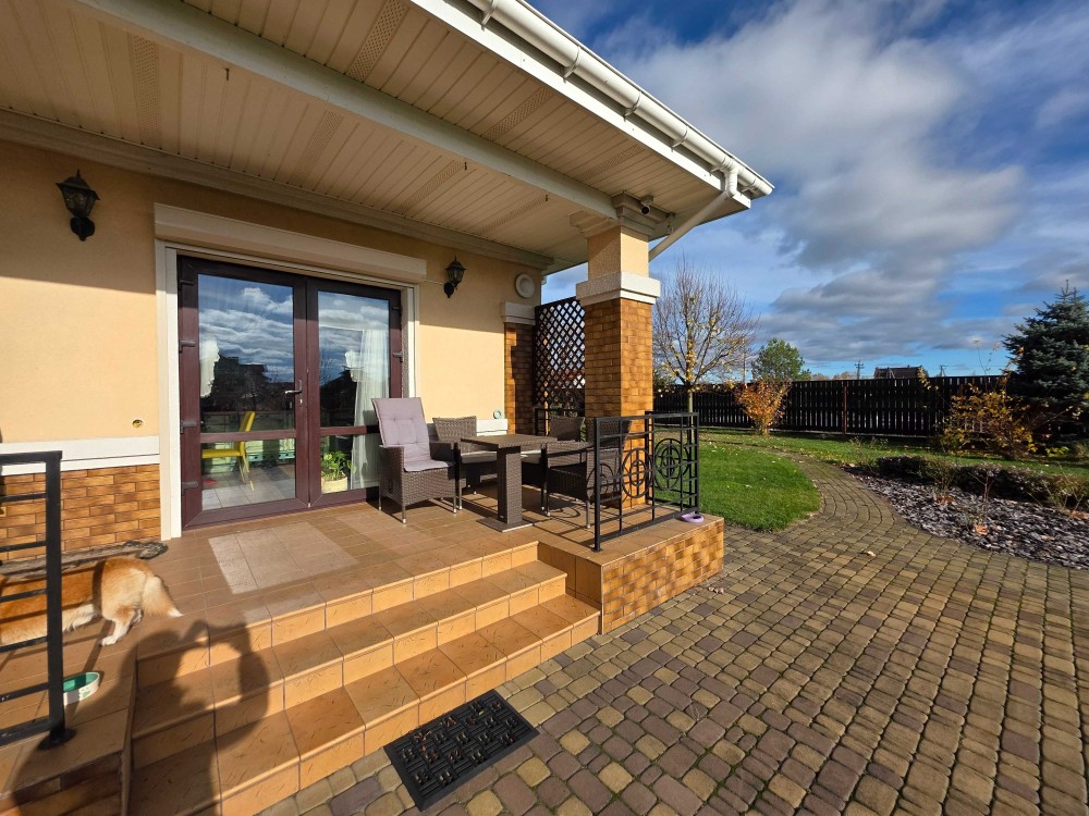 Загальна площа двоповерхового будинку - 230м.кв., раціональне планування, велика кухня, вітальня з каміном, тераса, бойлерна, комора, окремі чотири спальні кімнати, кабінет, баня з басейном, літній басейн з куполом на вулиці, альтанка, барбекю зона. На території ділянки є господарський будинок з погребом і дровником. В наявності генератор на 8 кВт, гараж на 2 автомобіля. Електро та газовий котли на опалення.