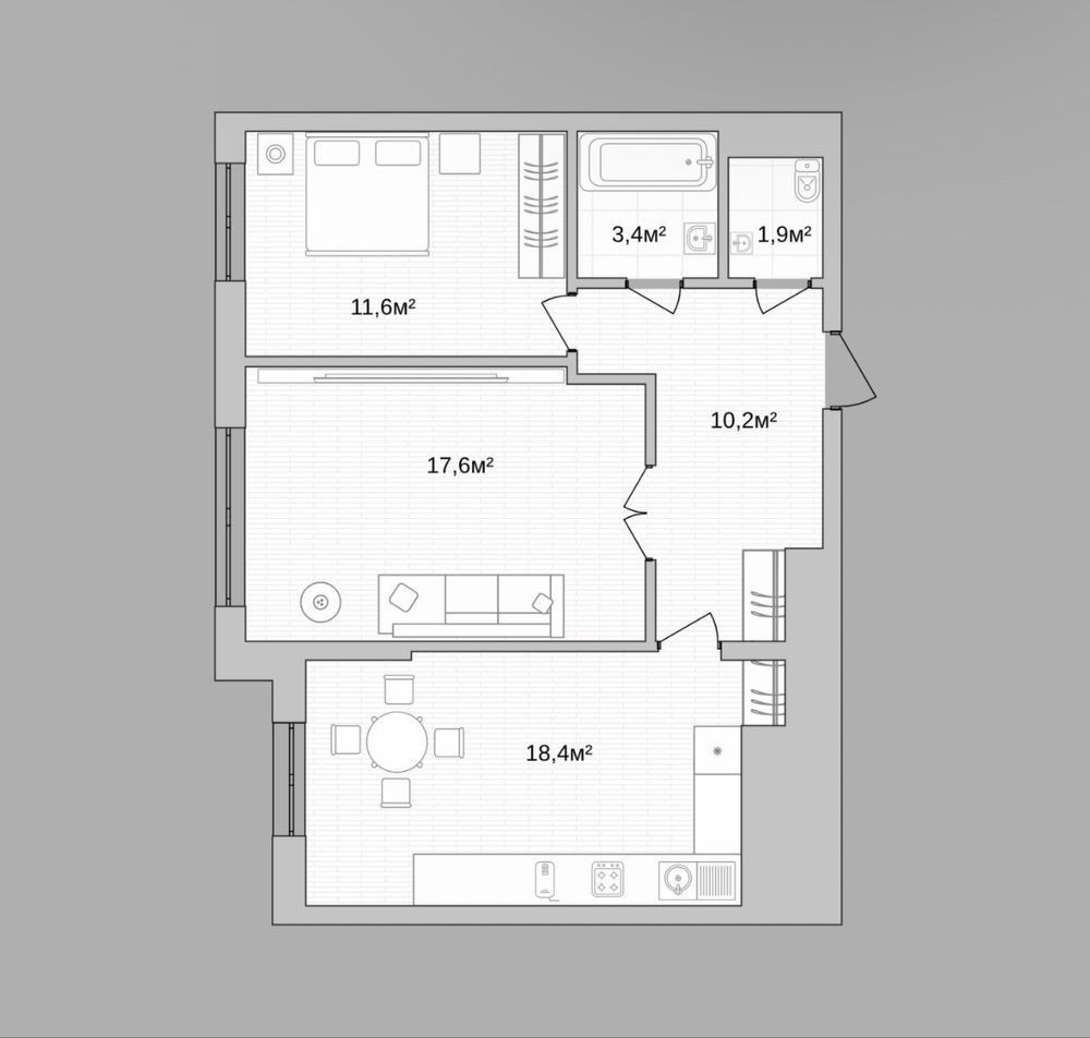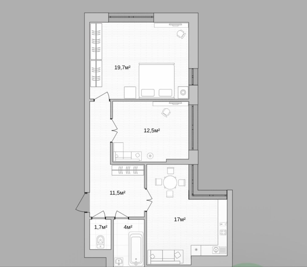 • Формат: кухня-вітальня та спальня (можлива зміна планування під власні потреби)