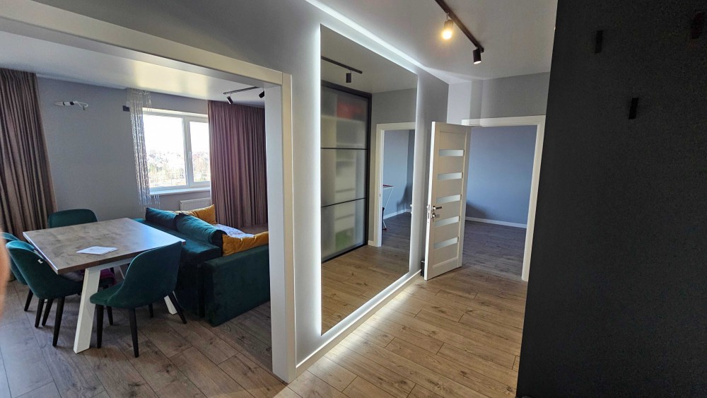 Квартира з сучасним ремонтом, виконаним з використанням високоякісних матеріалів. Робилась для себе. Не економили ні на чому. Квартирантів не було. Багато місця для зберігання речей. Підлога - дорогий приємний ламінат. Стеля - натяжна матова. Стіни - фарбовані. Німецька/італійська сантехніка. Подрібнювач відходів на кухні, кам'яна мийка. Меблі - вітчизняні преміум сегмент. На кухні стіл з натурального дерева. В кімнаті ліжко з топовим ортопедичним матрасом Венетто. Кондиціонер у кімнаті, у вітальні траса під ще один. Вся техніка від LG, Samsung, Bosch - вбудований холодильник, посудомийна машина, індукційна варильна поверхня, професійна духовка, два смарт ТВ 65 та 43 дюйми, саундбар, кава-машина Siemens, мікрохвильовка, електро чайник, бездротовий пилосмок, прально-сушильна машина. В коридорі дзеркало на всю стіну. Вхідні двері з посиленою фурнітурою.