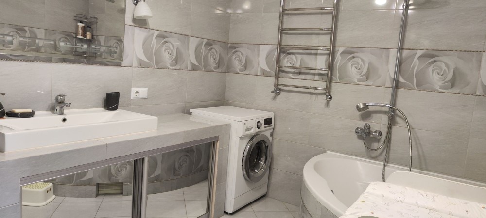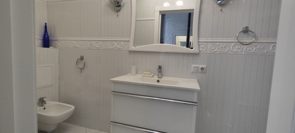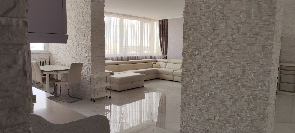 Велика кухня вітальня 60 м² та дві окремі спальні. Два санвузли один з кабіною,інший з ванною . Біде, умивальники, унітази в кожному з них. Міні балкон .