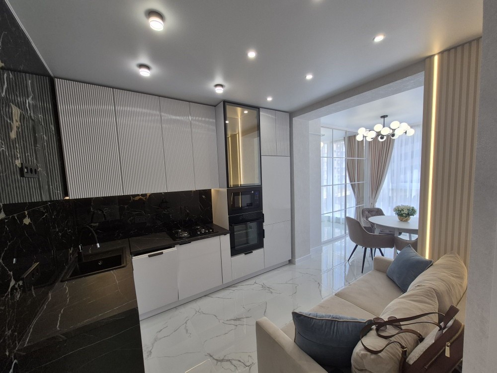 В квартирі зроблений якісний ремонт, встановлено техніку відомих торгових марок. Дуже вдале планування: кухня- студія + простора спальня.