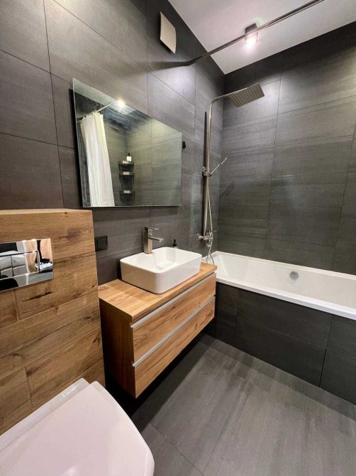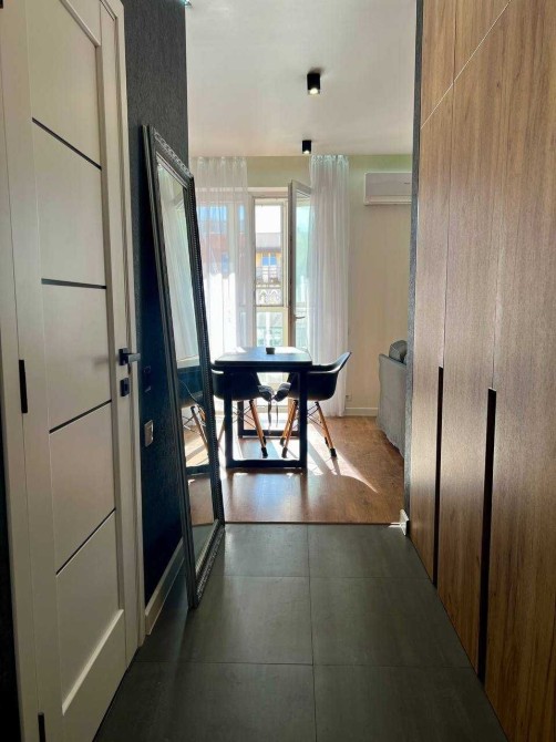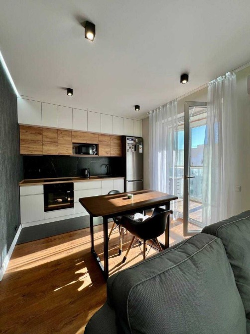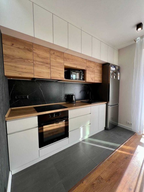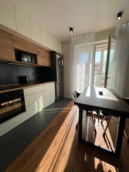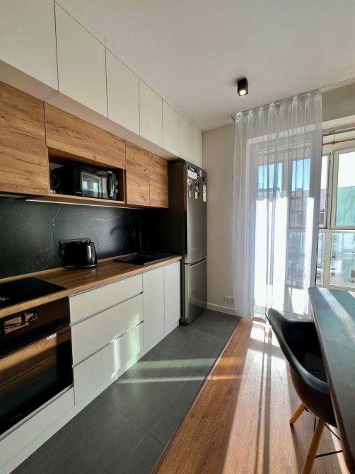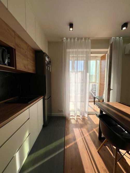 У квартирі виконано капітальний ремонт за дизайн-проєктом із використанням якісних матеріалів. Кухня обладнана шафами до стелі, що забезпечує багато місця для зберігання.
