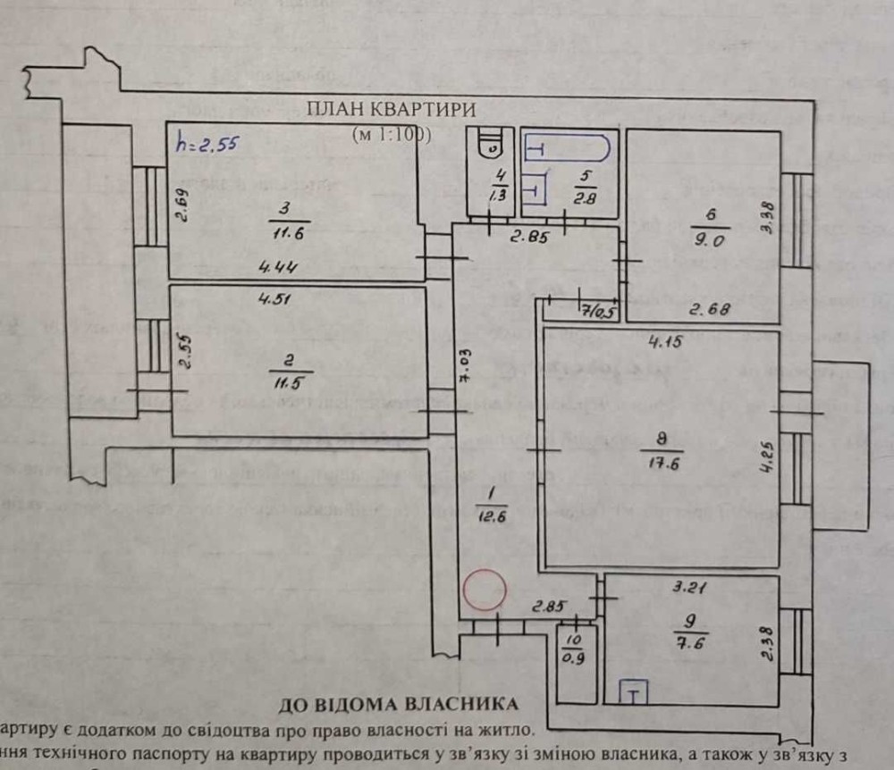 Будинок цегляний, квартира розташована на 5 поверсі 9 поверхового будинку, двостороння – вікна виходять на північний схід та південний захід. Загальна площа квартири 79,2 кв. м., житлова площа 49,7 кв. м. (зал – 17,6 кв. м., спальня – 11,5 кв. м., спальня – 11,6 кв. м., дитяча кімната – 9,0 кв. м.), кухня 7,6 кв. м., балкони з зали – засклений, подвійна лоджія зі сторони спалень засклена, санвузол окремо, бойлер. Встановлений кондиціонер, є резервне живлення на квартиру. Новий ліфт у під'їзді , також не відключають електроенергію і газова плита.