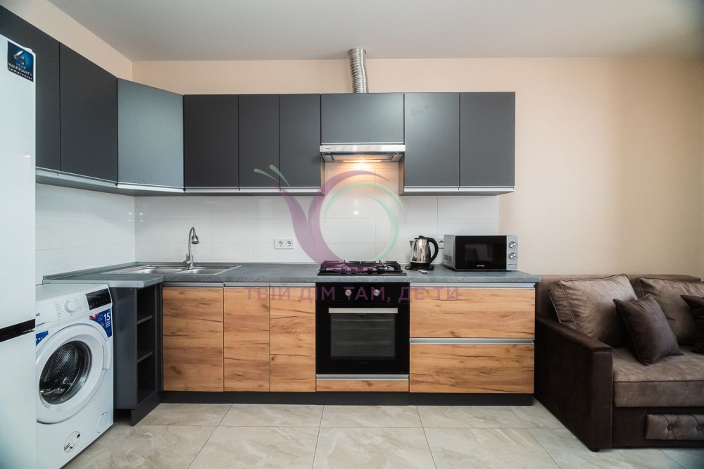 Кухня-студія площею 10 м2 має зручний диван, достатньо кухонних шафок, газову варильну поверхню, духовку, мікрохвильову, витяжну вентиляцію, мийку та зручну обідню зону.