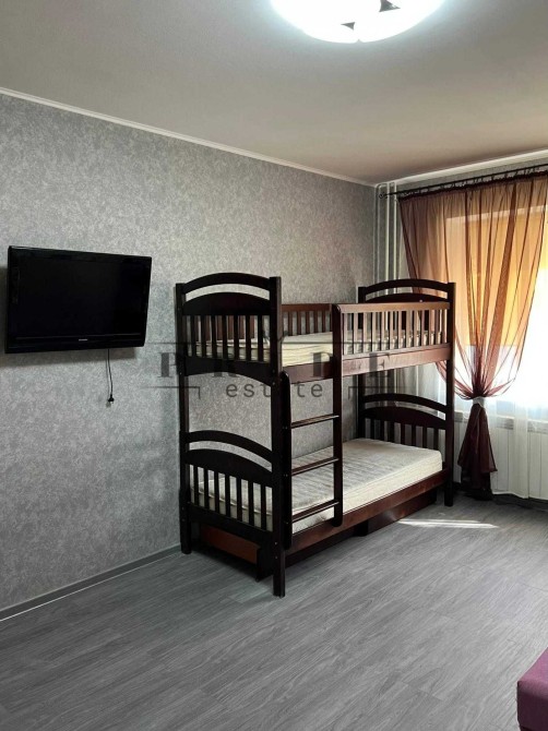 • У кімнаті — містка шафа-купе, розкладний двоспальний диван, двоярусне дитяче ліжко, телевізор