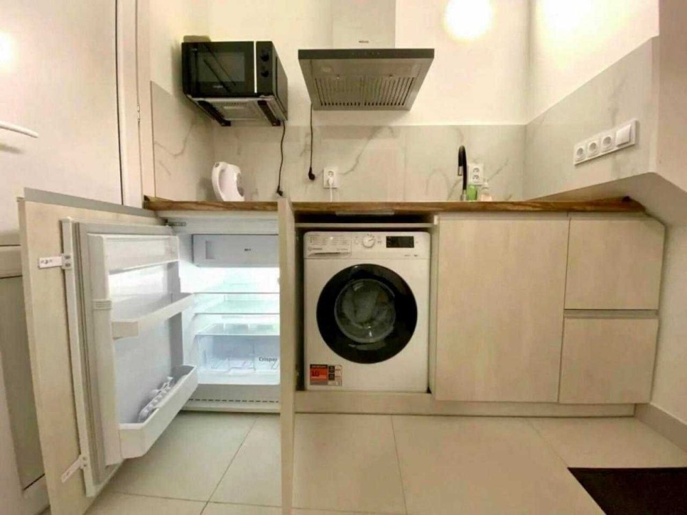 Кухня повністю укомплектована: мікрохвильова піч, електрочайник, посуд. Також є праска з прасувальною дошкою, сушарка для одягу, додаткові подушки та ковдра, пилосос.