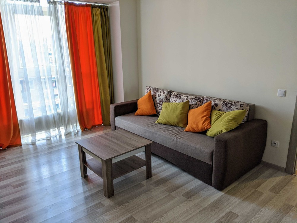 У кімнаті є диван, телевізор, шафа та стіл, на кухні – холодильник, газова плитка та духовка.