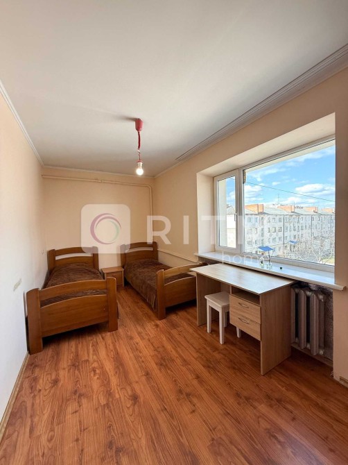 Друга кімната ідеально підійде як дитяча або спальня — у ній розміщено два односпальні ліжка та робочий стіл біля великого вікна.
