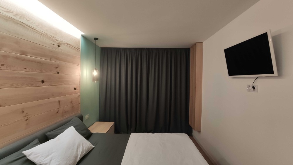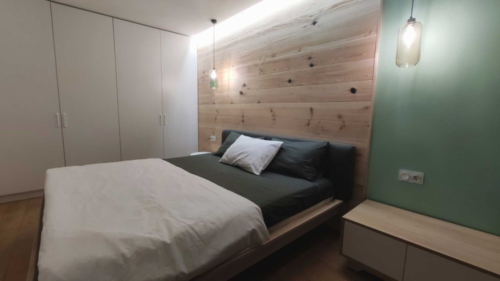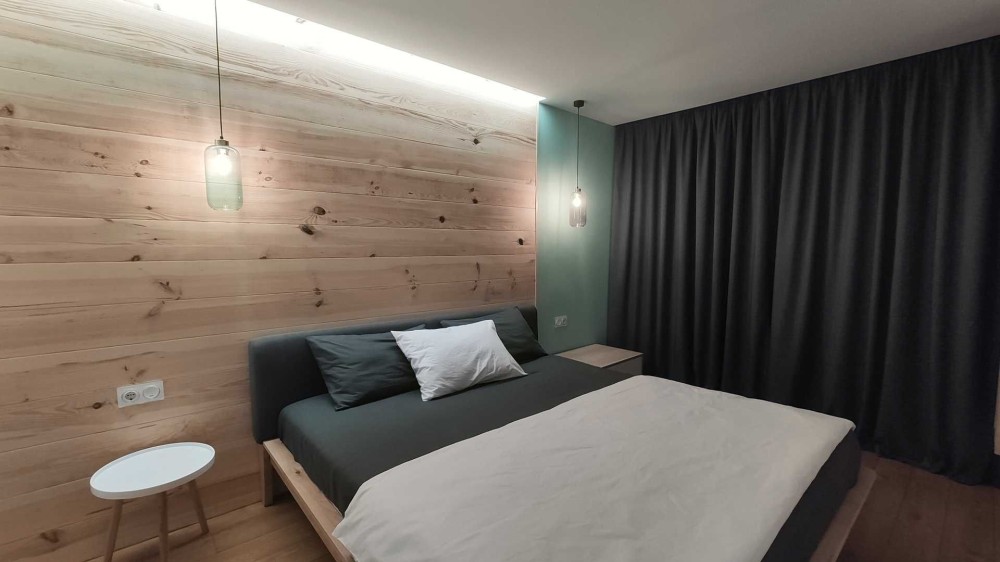 Спальня з великим ліжком, місткою шафою та сучасним підсвічуванням. Натуральні текстури дерева додають тепла та затишку. Встановлені темні штори blackout, які повністю блокують світло та забезпечують комфортний сон у будь-який час доби.