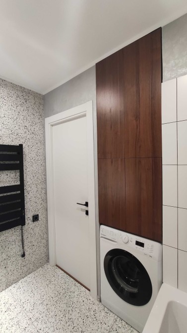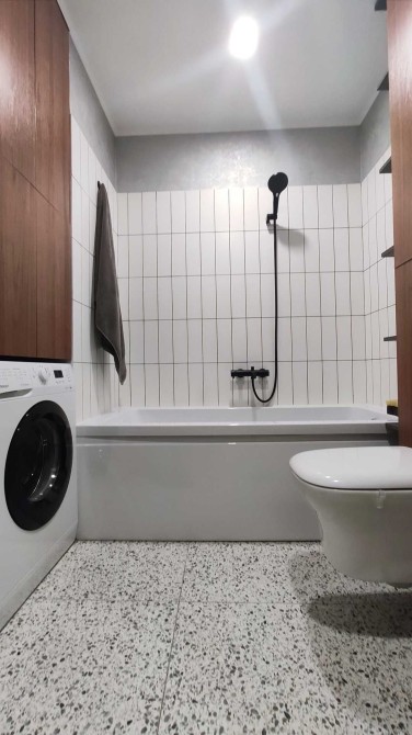 Ванна кімната з якісною сантехнікою, пральною машиною, стильним умивальником та зручними нішами для зберігання.