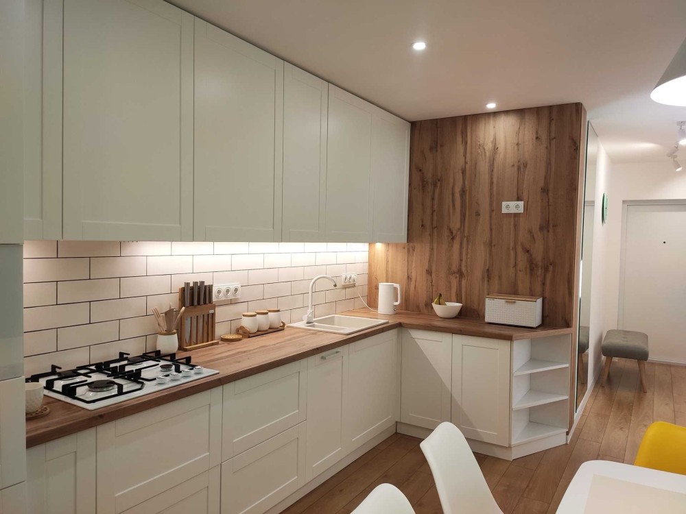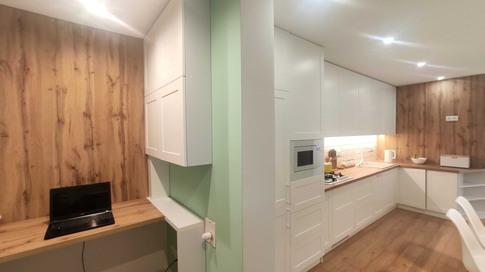 Кухня повністю укомплектована: вбудовані меблі, варильна поверхня, мікрохвильова піч, кавоварка, достатньо місця для зберігання. Є обідня зона з приємним освітленням.