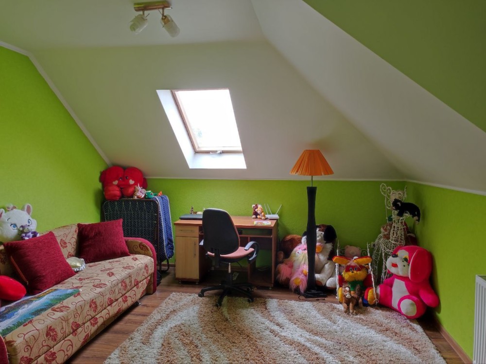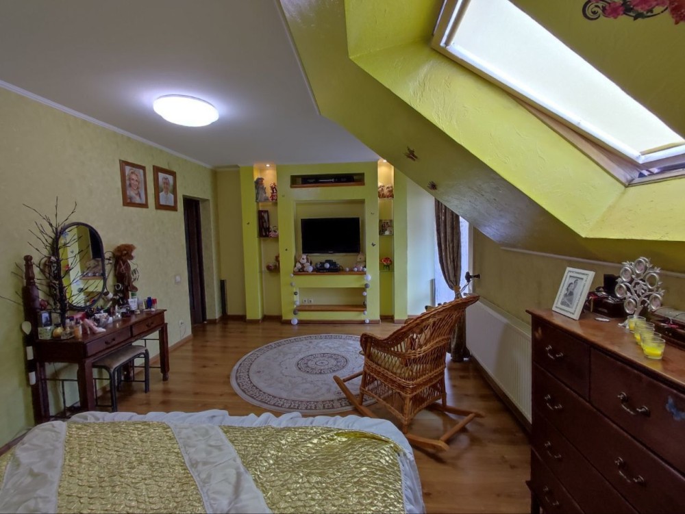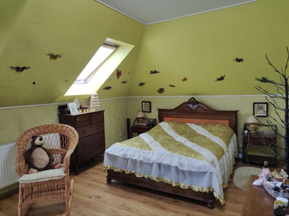 Село Забуччя. 13 км від КП по Житомирській трасі, 19 км від автост.Дачна. 4 км до ЖК Синергія (Ірпінь), 7 км до Бучі. Будинок має 6 кімнат (4 спальні), 2 зали, 4 санвузла, душова. Асфальтований під'Їзд.Будинок під охороною, камери відеоспостереження. Ділянка: Ландшафтний дизайн,басейн, автополив. Відкрита тераса з барбекю. Будинок має мансарду та цокольний поверх. На першому- хол та кухня-студіо, санвузол, туалет та гараж 35 кв.м.. На другому спальня та двоповерховий кабінет, який можно облаштувати під спальню. На третьому кабінет, спальня з санвузлом. Останній поверх- мансарда з санвузлом. На цокольному поверсі велика кімната( під спортзал)де є бігова доріжка, пральна, сауна,душова, техприміщення та 2 кімнати-кладові. На другому поверсі відкрита велика тераса, на третьому балкон. Підлога, керамограніт, плитка, ламінат. Газове опалення, підігрів підлоги на декількох поверхах. камін, сауна. 3 кондіціонера, газовий котел та електроболер. Інтернет оптоволокно.