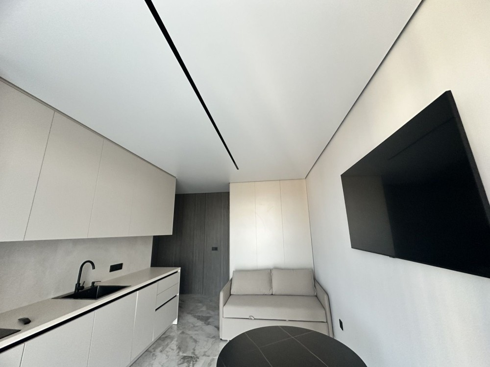 Простора зона кухні вітальня, що створює відчуття відкритого простору. Встановлена сучасна кухонна техніка: варильна поверхня, духова шафа, посудомийна машина, холодильник та витяжка. У зоні вітальні комфортний диван для відпочинку та можливість організувати обідній стіл.