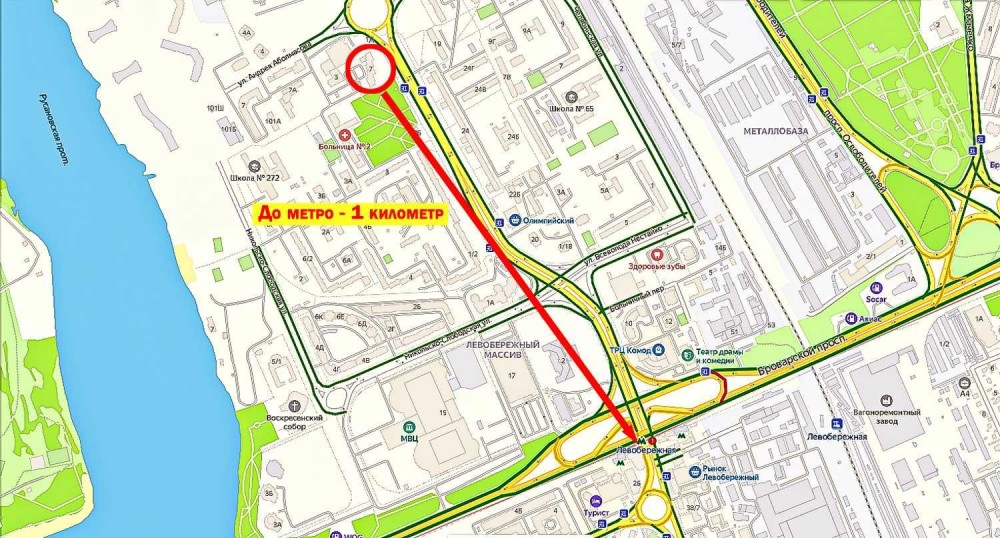 • Инфраструктура Детский сад, Школа, Остановка транспорта, Метро, Рынок, Аптека, Отделение почты