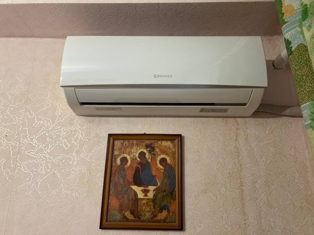 В кімнаті просторий диван та кондиціонер.