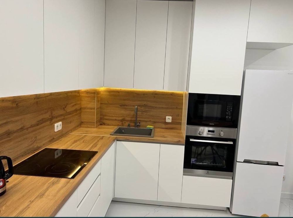 Кухня: варильна поверхня, духова шафа, мікрохвильова піч, витяжка, посудомийна машинка, чайник , невеликий бойлер , LED підсвітка, стіл кухонний та стільці . З кухні є вихід на балкон (є пуфи).