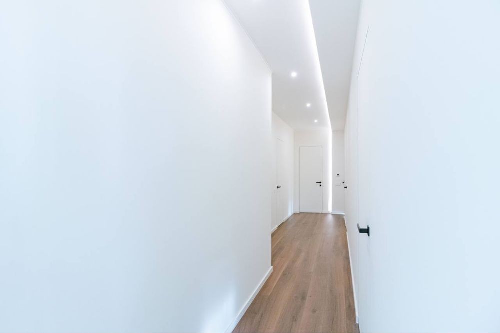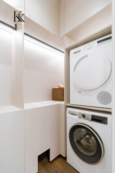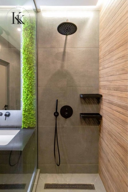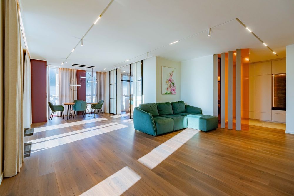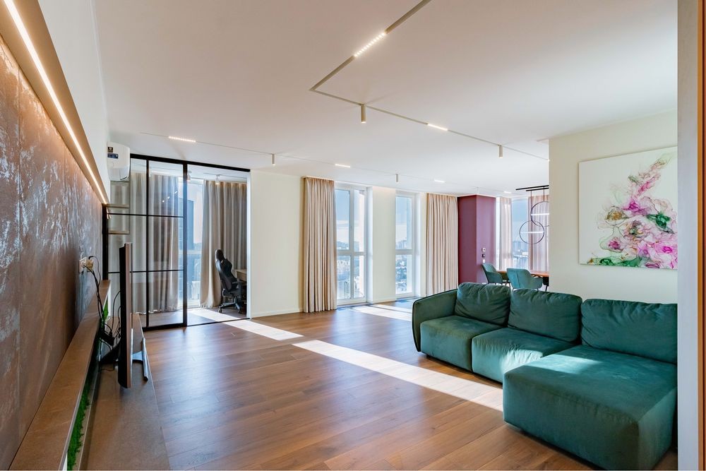 Загальна площа 165 м. кв. Спальня, дитяча, гостьова (або кабінет) кухня- вітальня , два санвузли, гардеробна та постірочна кімната. Також варто відзначити достатню кількість місць для зберігання, грамотно вбудованих у простір.
