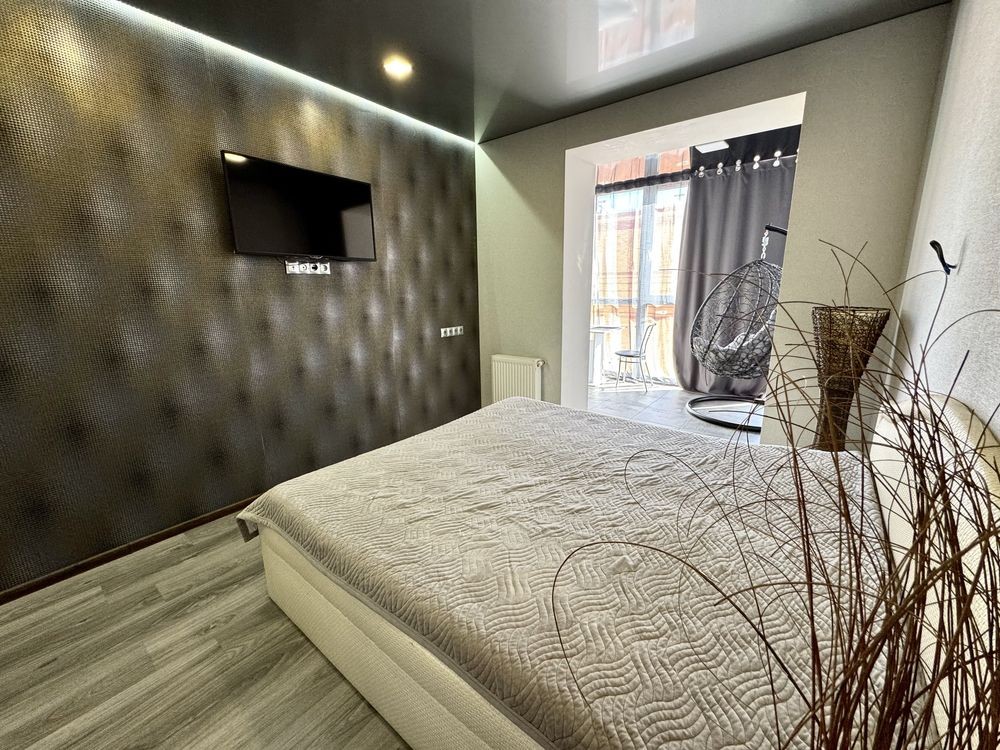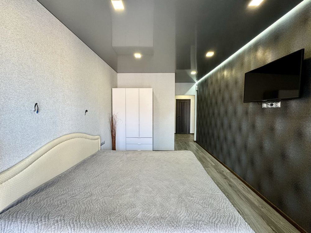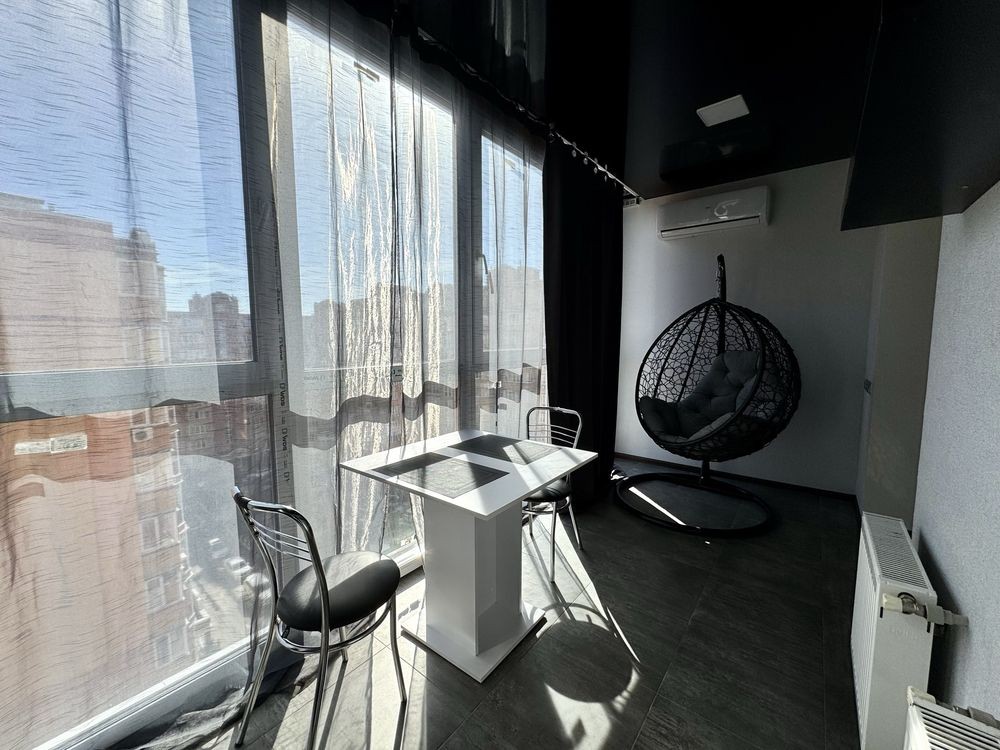 Комплектація: двоспальне ліжко, 2 шафи, телевізор, холодильник, газова плита, пральна машина, диван в зоні лоджії, кокон, кондиціонер.
