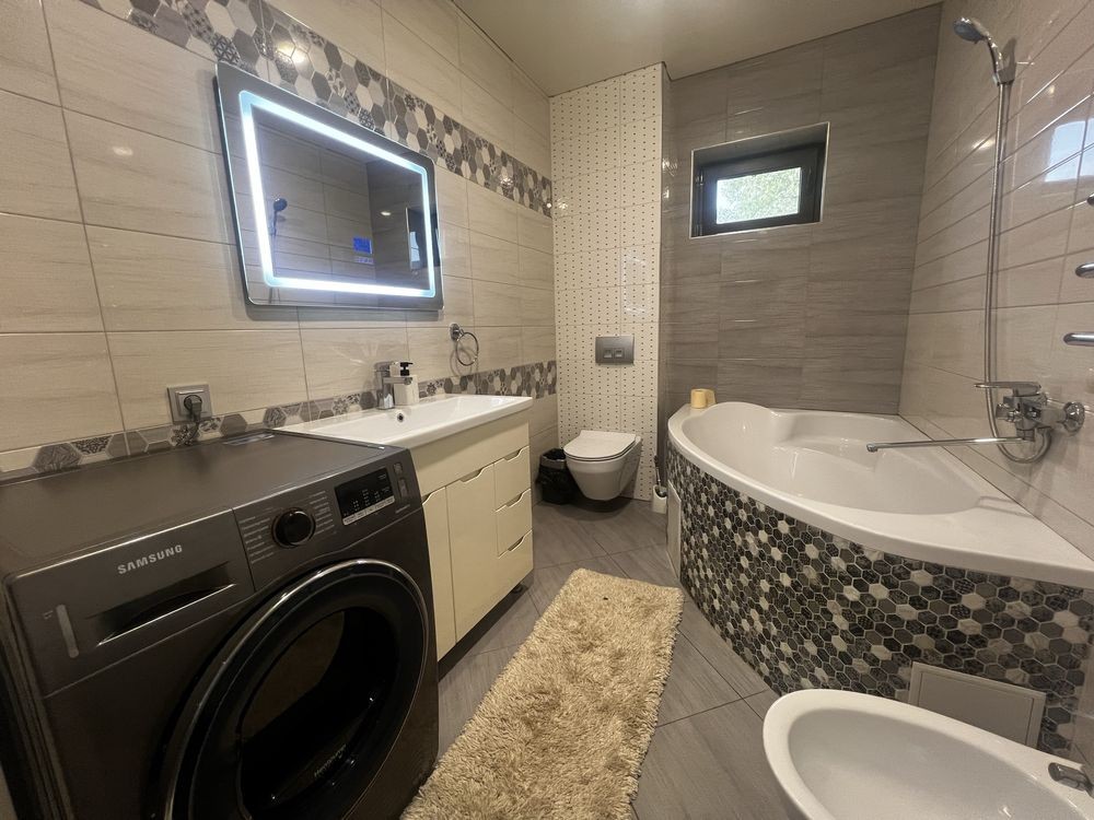 Село Забуччя. 13 км від КП по Житомирській трасі, 19 км від автост.Дачна. 4 км до ЖК Синергія (Ірпінь), 7 км до Бучі. Будинок має 6 кімнат (4 спальні), 2 зали, 4 санвузла, душова. Асфальтований під'Їзд.Будинок під охороною, камери відеоспостереження. Ділянка: Ландшафтний дизайн,басейн, автополив. Відкрита тераса з барбекю. Будинок має мансарду та цокольний поверх. На першому- хол та кухня-студіо, санвузол, туалет та гараж 35 кв.м.. На другому спальня та двоповерховий кабінет, який можно облаштувати під спальню. На третьому кабінет, спальня з санвузлом. Останній поверх- мансарда з санвузлом. На цокольному поверсі велика кімната( під спортзал)де є бігова доріжка, пральна, сауна,душова, техприміщення та 2 кімнати-кладові. На другому поверсі відкрита велика тераса, на третьому балкон. Підлога, керамограніт, плитка, ламінат. Газове опалення, підігрів підлоги на декількох поверхах. камін, сауна. 3 кондіціонера, газовий котел та електроболер. Інтернет оптоволокно.