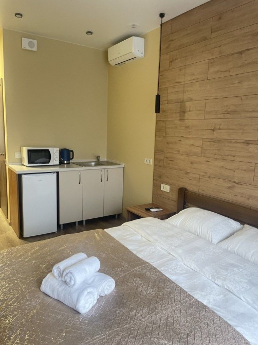 В кожній кімнаті є велика шафа, кондиціонер, телевізор, чайник, мікрохвильовка, холодильник, базовий набір посуду, письмовий стіл та стілець, wi fi, охорона, камери відеоспостереження.