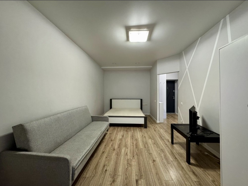Кімната: двоспальне ліжко, розкладний диван, робочий стіл, столик, телевізор, шафа. Освітлення по зонам.