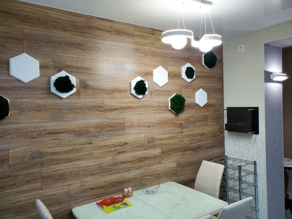 Над столом вздовж стіни виконано оригінальну інсталяцію у вигляді сот з живим мохом.
