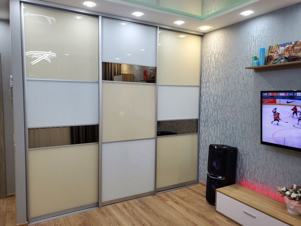 У залі розмістили великий і комфортний кутовий диван призначений для щоденного сну, журнальний столик, а стінка з телевізором також є містка вбудована шафа-купе.
