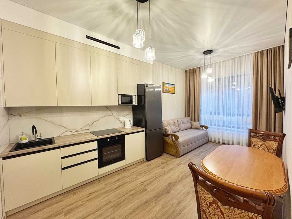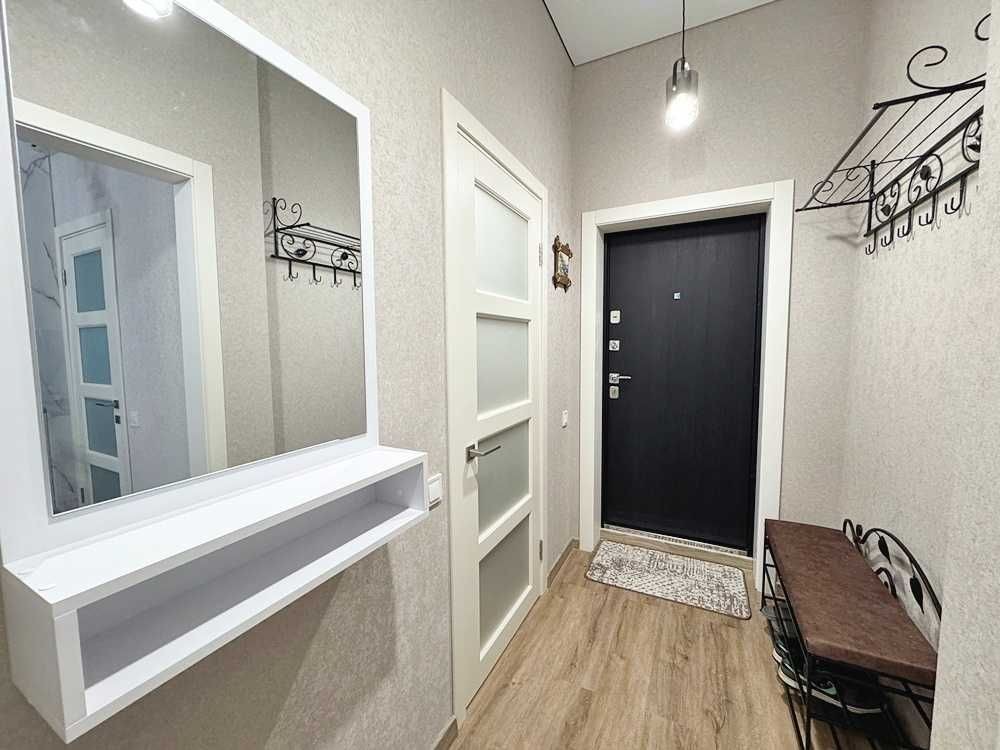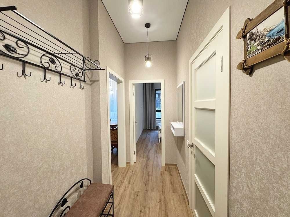 Квартира укомплектована всім необхідним для проживання — ліжко з матрацом, приліжкові тумби, диван, телевізор, обідній стіл зі стільцями. Підлога виконана з якісного ламінату, тепла підлога встановлена в кухонній зоні та санвузлі.