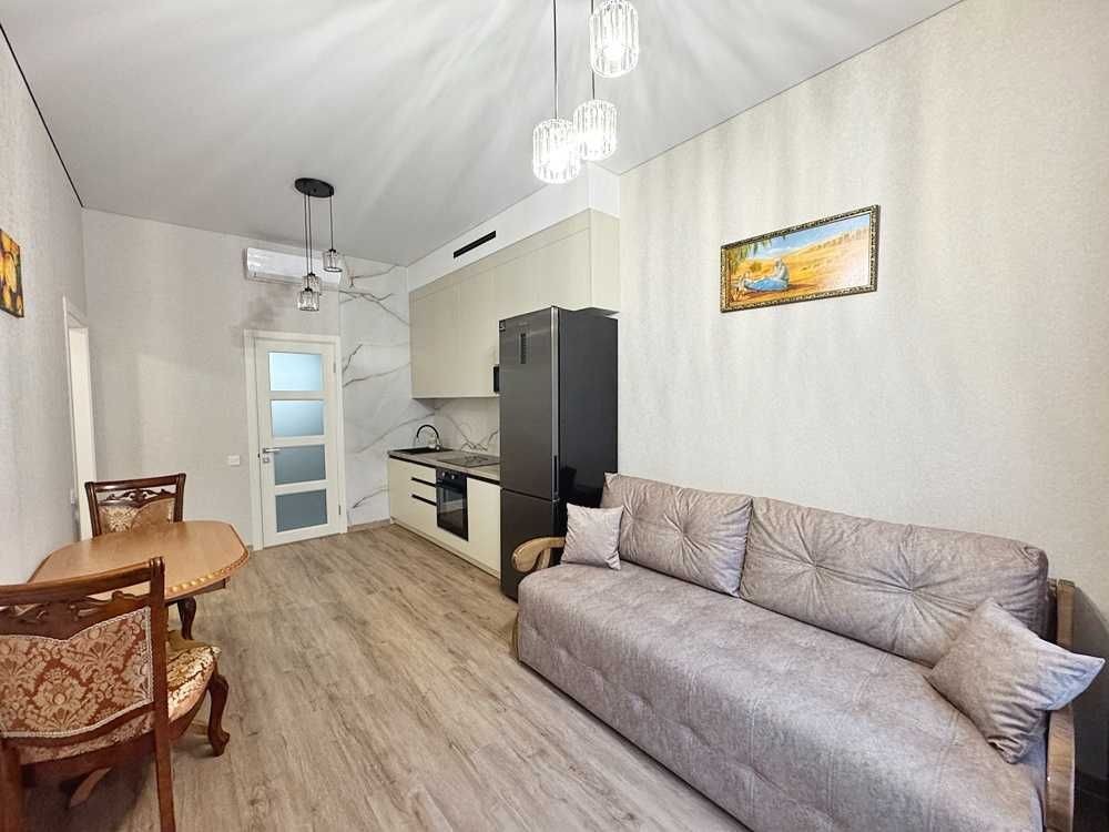 Планування передбачає кухню-студію з вітальнею, спальню, простору гардеробну кімнату та суміжний санвузол. У кухні встановлено вбудовані меблі та побутову техніку: індукційну варильну поверхню, духову шафу, мікрохвильову піч, холодильник. У санвузлі розміщені ванна, пральна машина, бойлер, інсталяція та система підігріву підлоги.