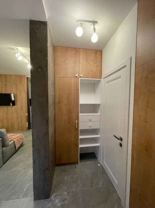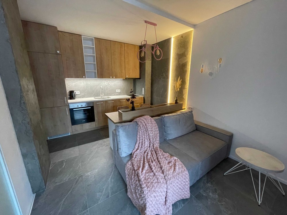 Окрема спальня з двоспальним ліжком та місткою шафою. Вітальня поєднана з кухнею, обладнана всією необхідною технікою європейських брендів для комфортного проживання. Є окрема робоча зона. Коридор з великою шафою для зберігання речей. Планування максимально продумане, розумно використаний кожен квадратний метр.