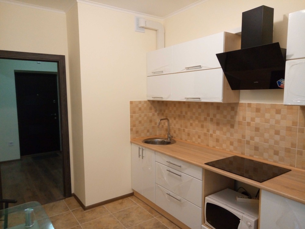 Кухня: кухонні меблі, холодильник, електроплита, мікроволнова піч, стіл та стільці,тюль ,деякий посуд та приладдя.