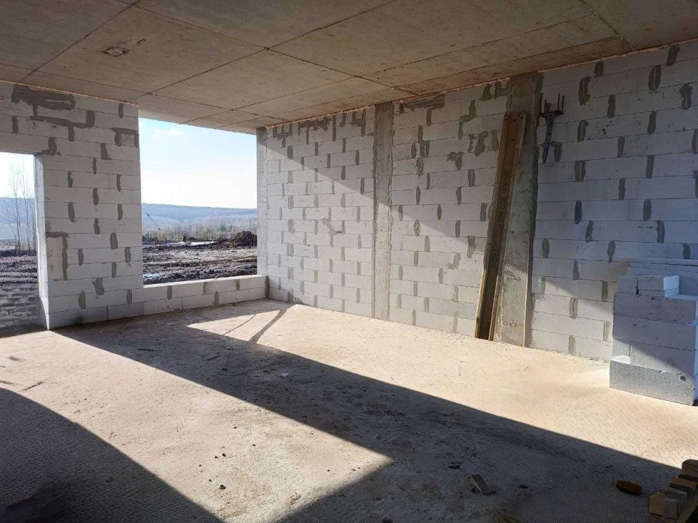 Забудовник монтує бетонні сходи, встановлює хороші вхідні двері і енергозберігаючі вікна, робить вивід під камін, яким можна буде опалювати весь будинок( за бажанням).