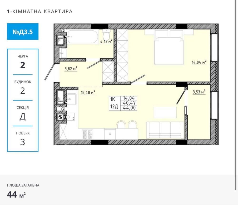 Площа 44 м2