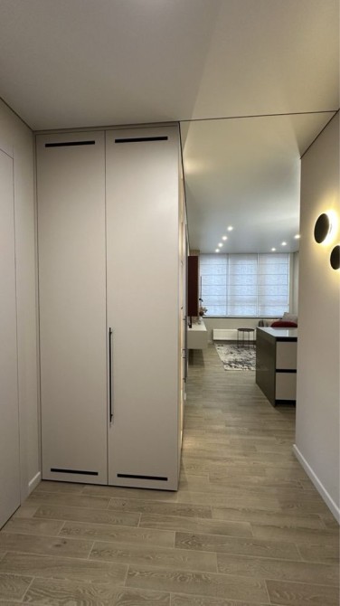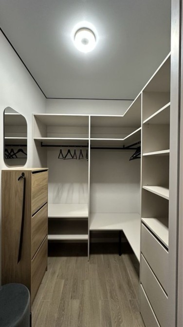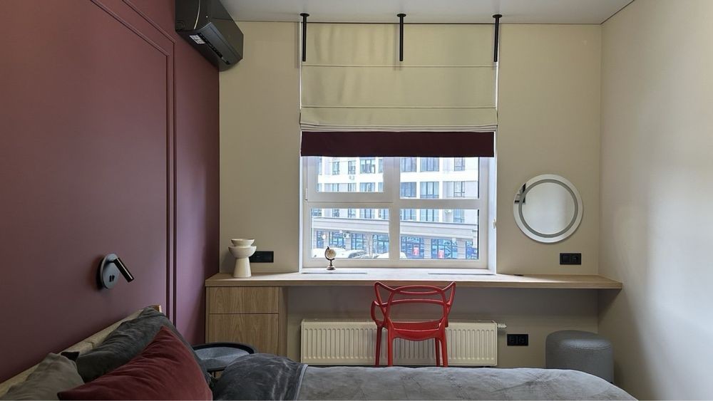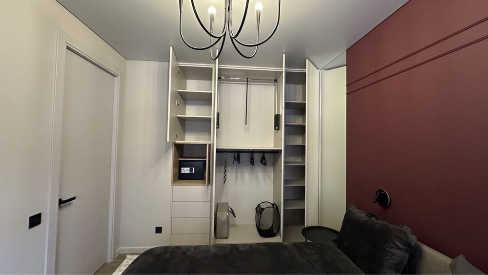Кухня-студія, окрема гардеробна кімната, затишна спальня з робочим місцем і вбудованою шафою.