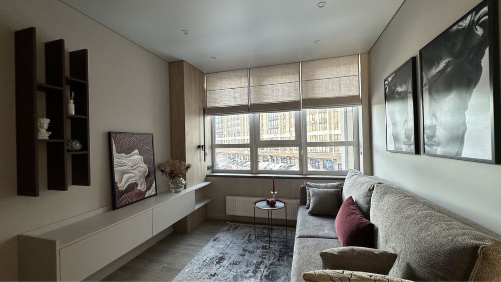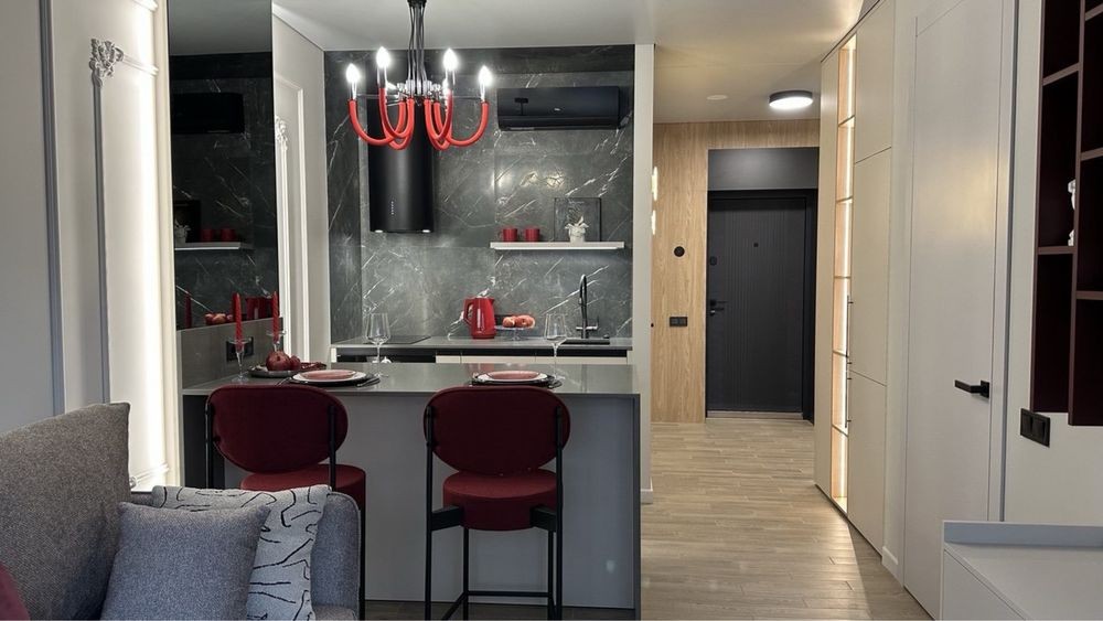 Квартира з ремонтом за дизайн-проектом (див. фото) і повністю готова до проживання. Є всі необхідні меблі, техніка, різні сценаріі освітлення, прохідні вимикачі, текстиль та декор.