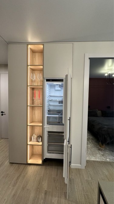 Кухня оснащена індукційною варильною поверхнею, потужною вбудованою витяжкою, духовою шафою з мікрохвилівкою ,є також посудомийна машина на 9 комплектів посуду (45 см), холодильник вбудований. Під мийкою розташований фільтр для води та датчик від протічок. Є осмос.