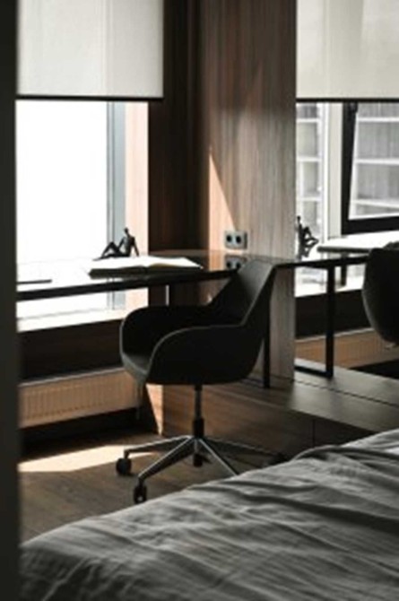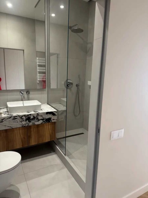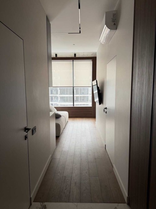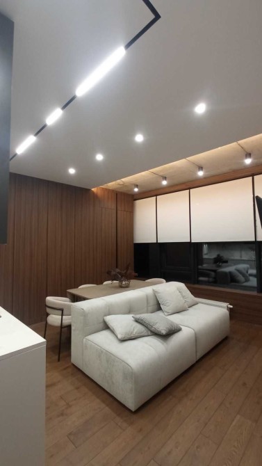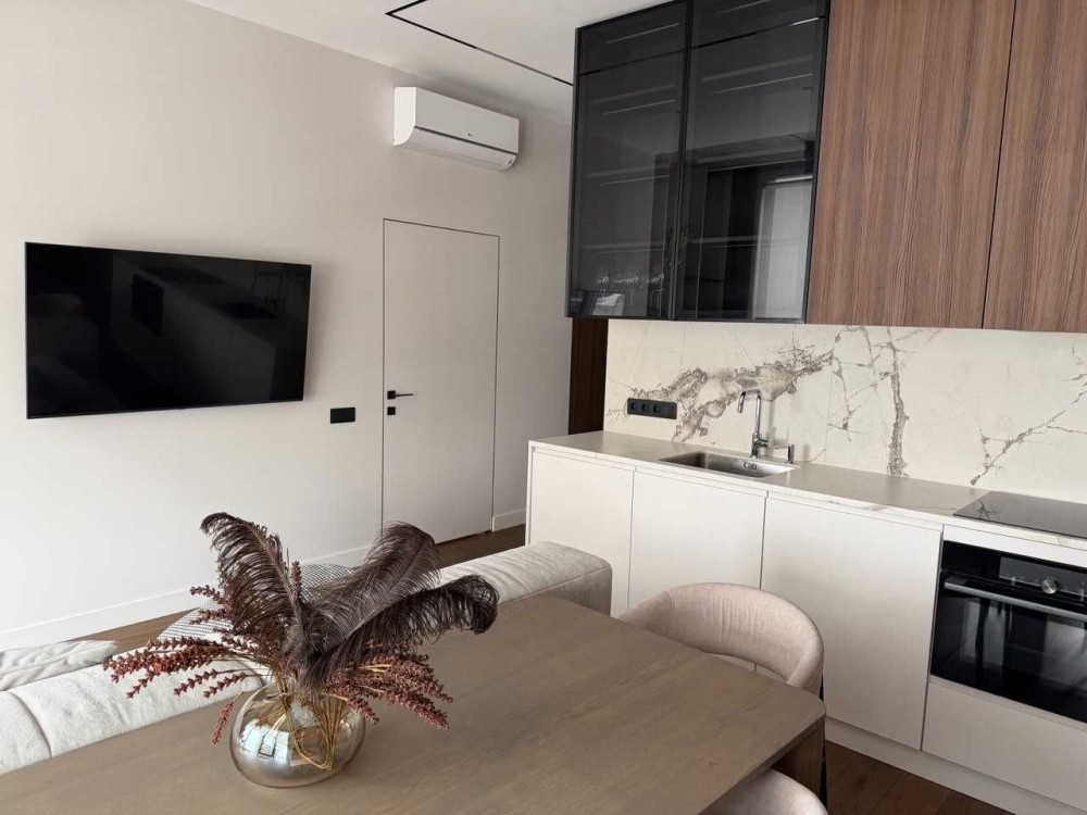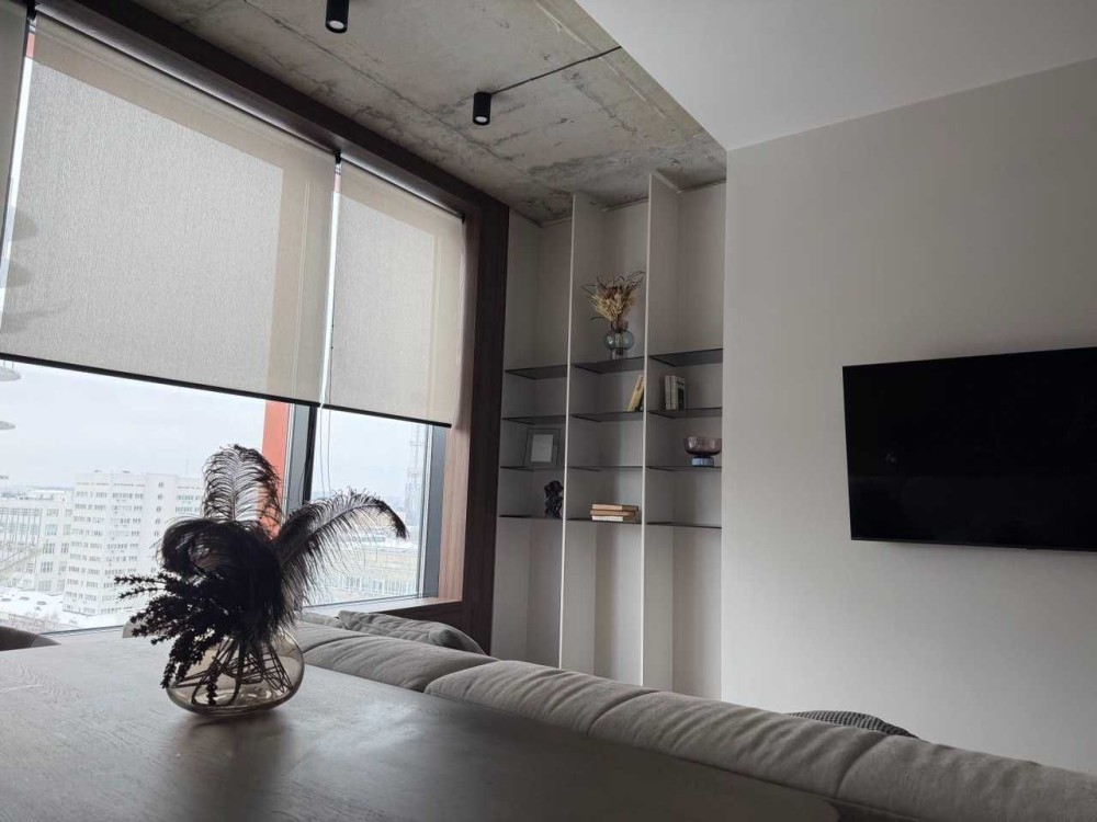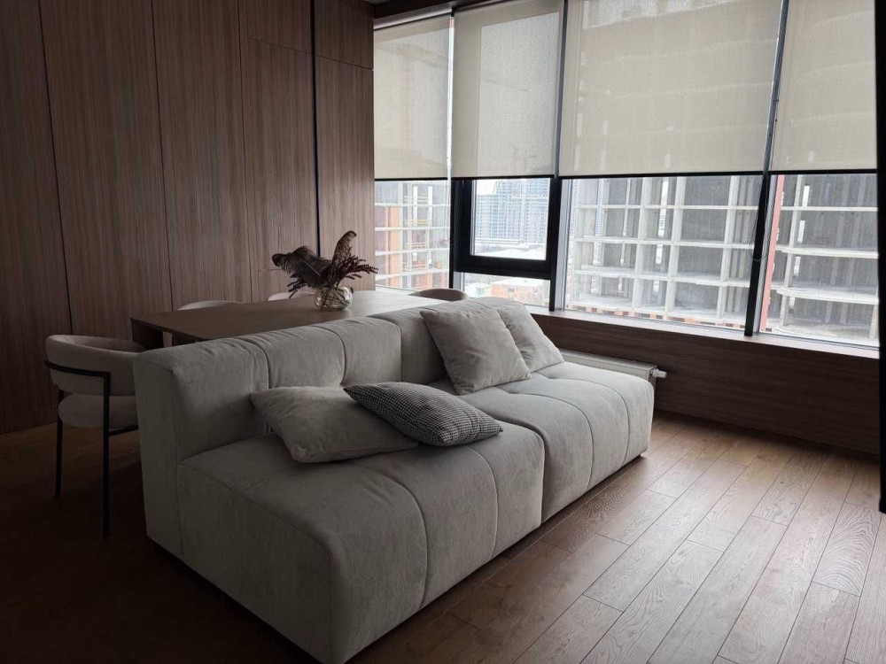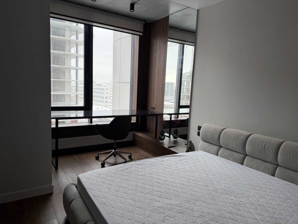 Вітальня, гостьова-студіо з красивою панорамою столиці за вікном; окрема спальня з великою робочою зоною і безмежним простором за шибкою; сумісний санвузол з місткою душовою. Тропічний душ. Тепла підлога в прихожій і ванній.