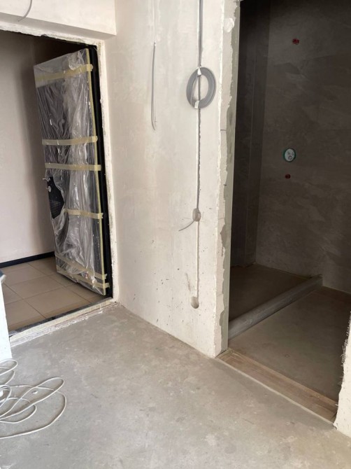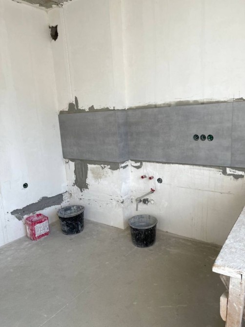 В квартире начат ремонт: проведена электрика, стены оштукатурены, санузел облицован.
