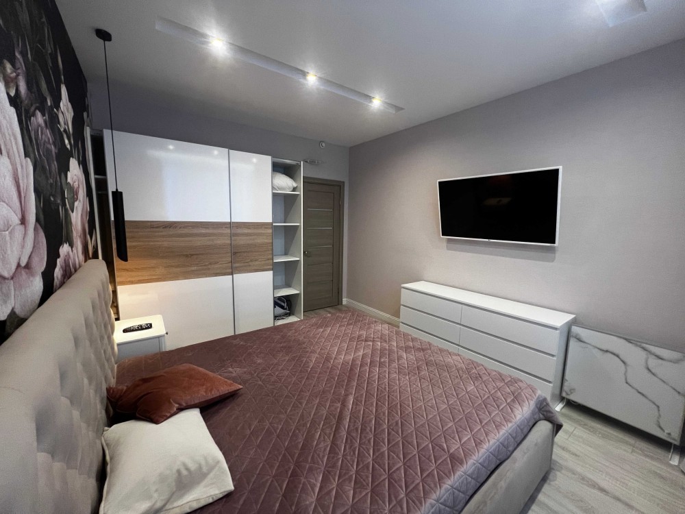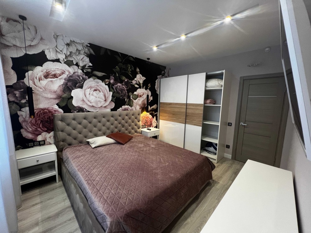 • Спальня: Окрема затишна кімната. Велике двоспальне ліжко з м'яким узголів'ям, містка шафа-купе, комод.
