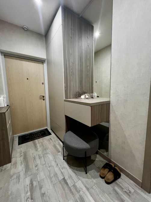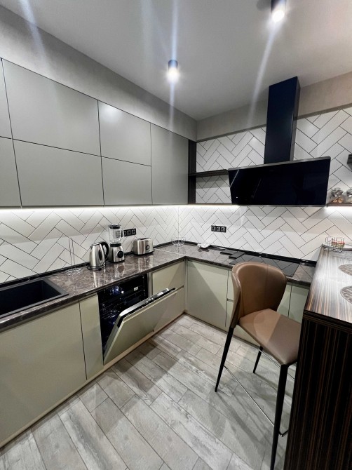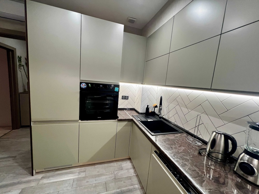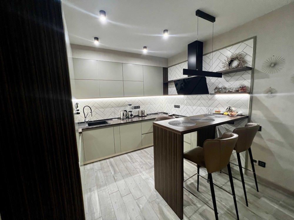 • Кухня-студія: Сучасна вбудована кухня з ефектною підсвіткою, обідня зона (стильна барна стійка), зона відпочинку з великим м'яким диваном.